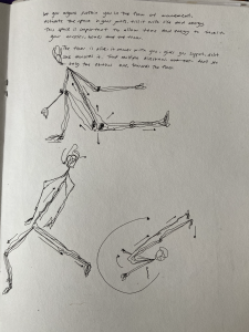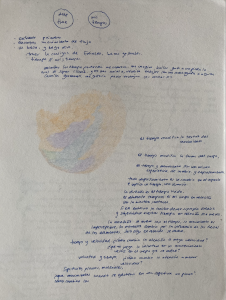 Escribir es traer al presente formas de comprender un acontecimiento, vincular memorias, vivencias, saberes. Escribir como una práctica creativa de articulación, de vínculos, de posicionamientos, de flujos y temporalidades. En mi práctica, la escritura ha sido parte de mis procesos de movimiento. Escribo para entender dónde estoy y con qué elementos me relaciono en el momento presente, para reconocerme en un tiempo-lugar y a la vez para saberme parte de un movimiento más grande, en relación con otras voces e ideas. Escribir es también trazar, en el trazo se contienen también los restos de la memoria y el gesto del cuerpo.